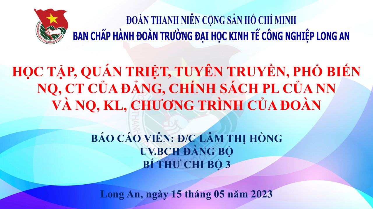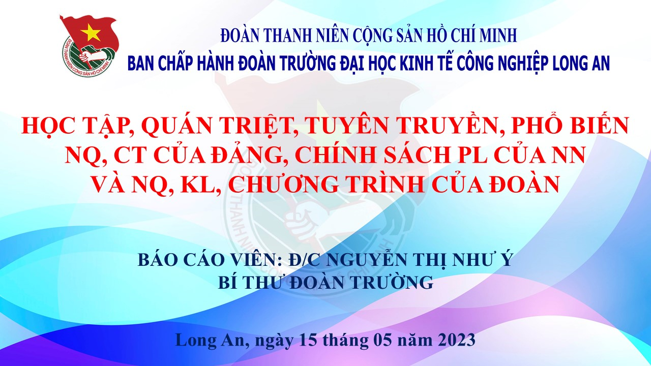 Ngày 15-5-2023 tại Hội trường F201 Đoàn trường Đại học Kinh tế Công nghiệp Long An (DLA) tổ chức chuyên đề “Học tập, quán triệt, tuyên truyền, phổ biến Nghị quyết, chủ trương của Đảng, chính sách pháp luật của Nhà nước và Nghị quyết, kết luận, chương trình của Đoàn”. Tham dự chuyên đề có đồng chí Nguyễn Thị Như Ý – Bí thư Đoàn trường, đồng chí Lâm Thị Hồng – UV.BCH Đảng bộ, Bí thư Chi bộ 3 Trường DLA cùng với hơn 500 cán bộ đoàn, đoàn viên, sinh viên Nhà trường.